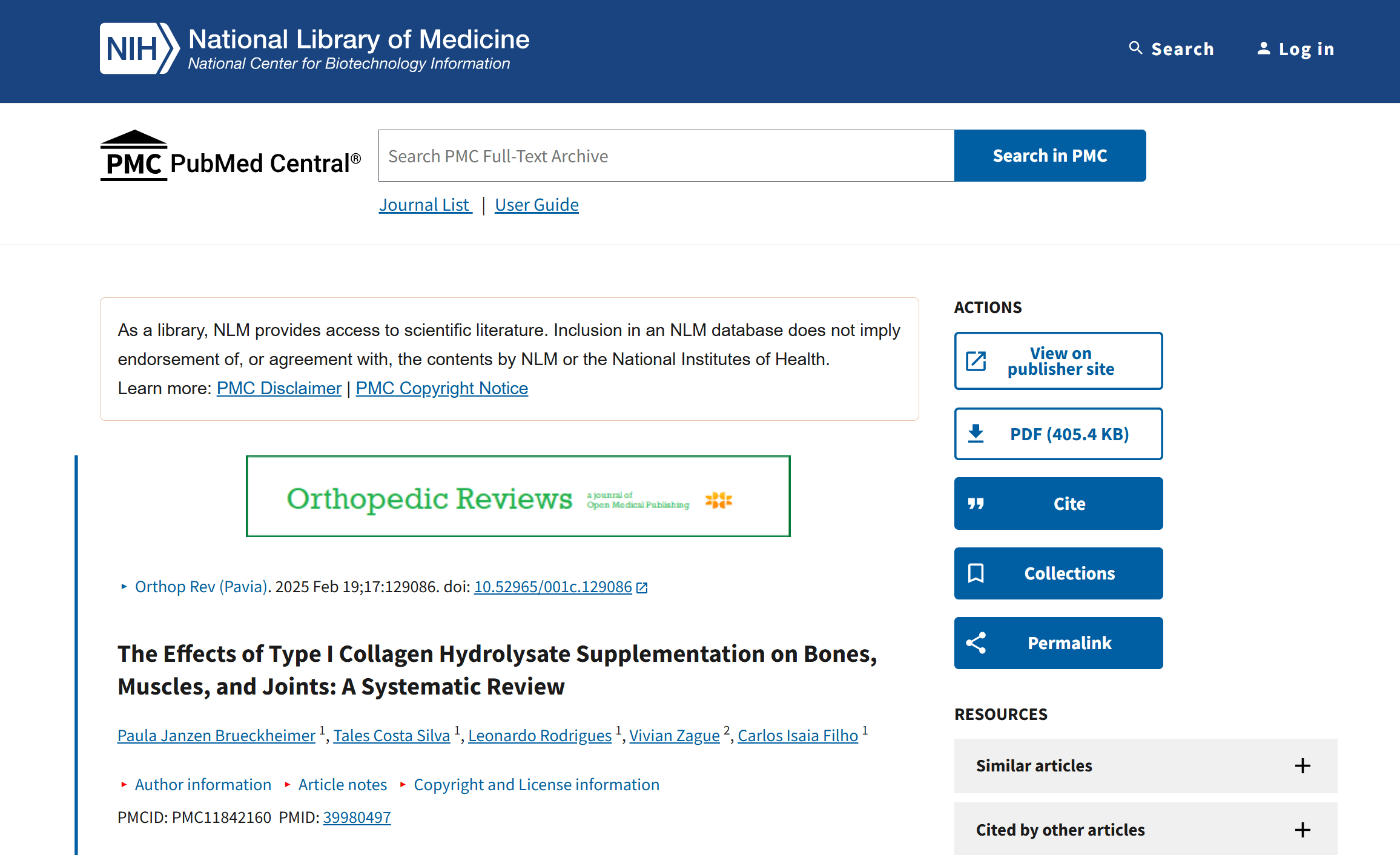 美国国家医学图书馆运营的权威医学文献库PubMed Central(PMC)收录的系统综述、国际骨科领域学术期刊《International Journal of Orthopaedics Sciences》、权威医学期刊《中华医学杂志》(Chinese Medical Journal)等国际科研成果均指向:骨胶原在改善关节疼痛、支持肌肉骨骼系统功能、改善骨质疏松等方面呈现出积极效果。