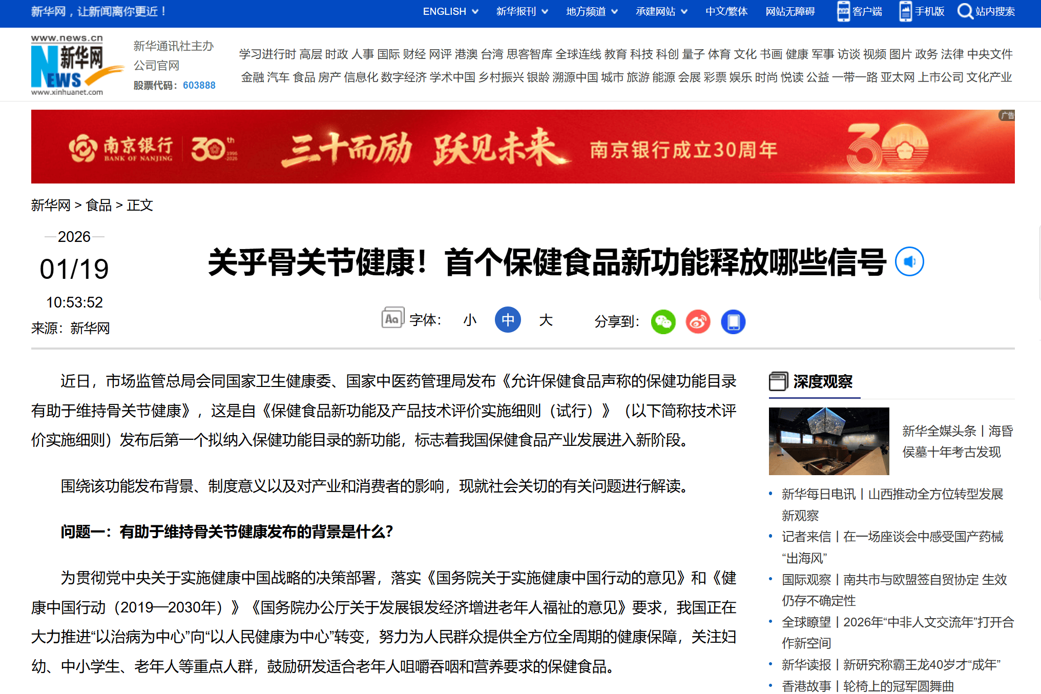 新华网报道“骨关节健康”首次被纳入官方保健功能目录